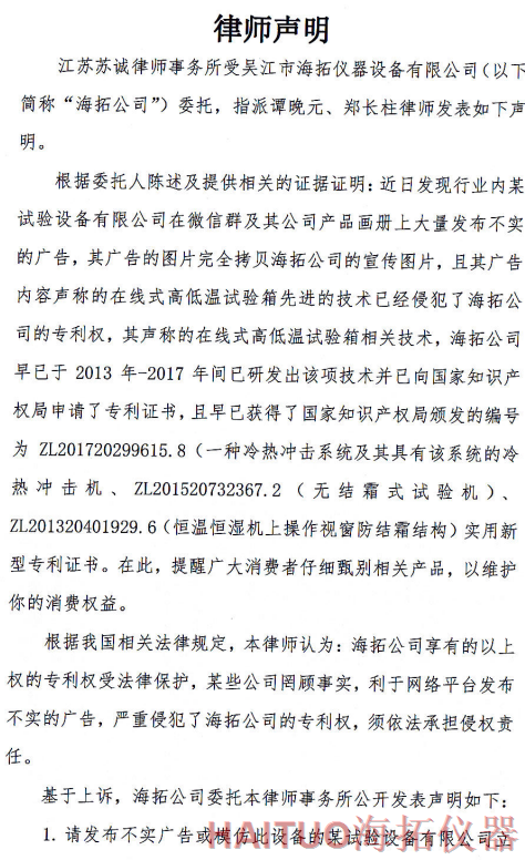 海拓儀器律師聲明:反對侵權(quán)行為 維護(hù)公司和消費(fèi)者權(quán)益摘要:國內(nèi)試驗(yàn)設(shè)備領(lǐng)先者吳江市海拓儀器設(shè)備有限公司委托律師事務(wù)所發(fā)布了律師聲明,該聲明指出,當(dāng)前市面上出現(xiàn)了產(chǎn)品專利侵犯海拓儀器權(quán)益,海拓儀器將以法律手段維護(hù)自身利益。該律師聲明要求某試驗(yàn)設(shè)備有限公司立即停止侵權(quán)行為,扯下其在網(wǎng)絡(luò)平臺的相關(guān)廣告和宣傳畫冊并同時停止生產(chǎn)同款設(shè)備。如果該設(shè)備公司不聽勸解,海拓儀器將向人民法院依法起訴該公司侵權(quán)行為,以維護(hù)自身合法權(quán)益和維護(hù)客戶消費(fèi)權(quán)益,并建議廣大消費(fèi)者仔細(xì)甄別相關(guān)產(chǎn)品。? ? ? ?近日,吳江市海拓儀器設(shè)備有限公司委托律師事務(wù)所發(fā)布了律師聲明,該聲明指出,當(dāng)前市面上出現(xiàn)了產(chǎn)品專利侵犯海拓儀器權(quán)益,海拓儀器將以法律手段維護(hù)自身利益。??事件源起于海拓儀器發(fā)現(xiàn)市面上有同類設(shè)備公司通過完全拷貝海拓儀器產(chǎn)品宣傳圖片,在微信群及該公司產(chǎn)品畫冊上大量發(fā)布不實(shí)廣告。??聲明指出,該廣告聲稱的在線式高低溫試驗(yàn)箱的技術(shù)侵犯了海拓儀器的專利權(quán),該產(chǎn)品專利由海拓儀器 -